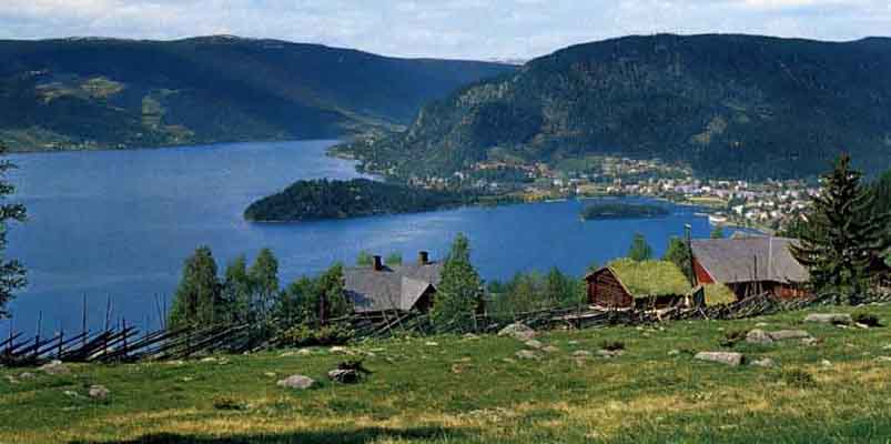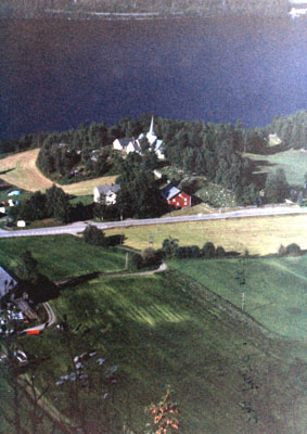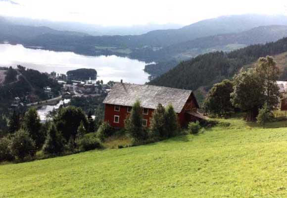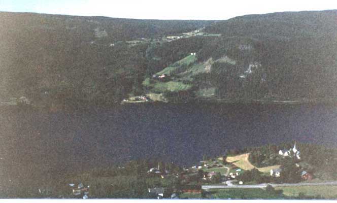 The pictures below show a view looking at the Haugen and Oydegarden farms across Strondafaorden lake from the Svenes Church on the Fagernes side. The farms are directly across from the Church, The Haugen farm starts at the lake and is about 75 acres in size.