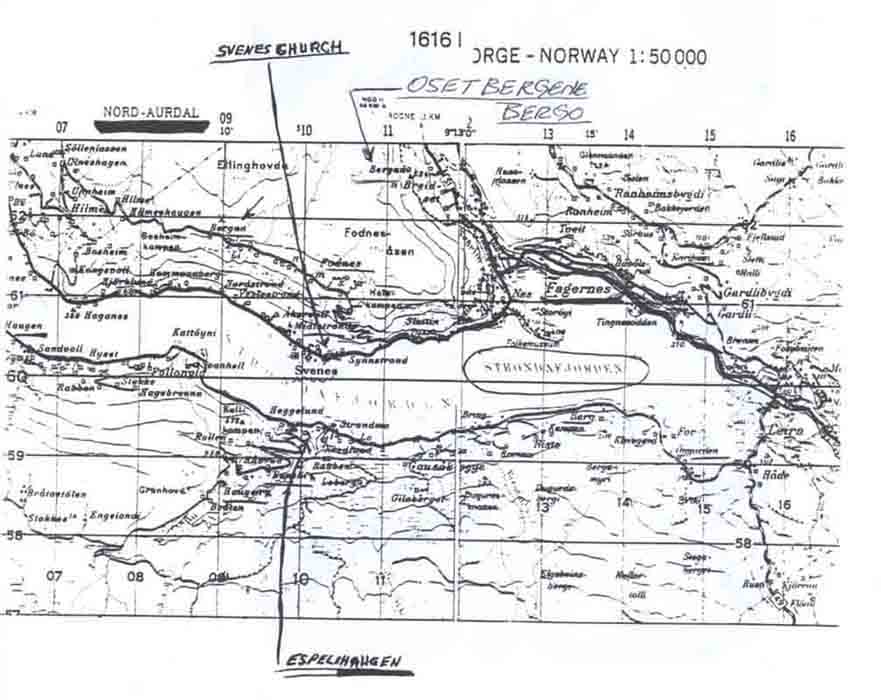 the following is a map showing the location of the farms, Haugen, Oydegarden, and Bergo relative to Fagernes and the Svenes Church.
