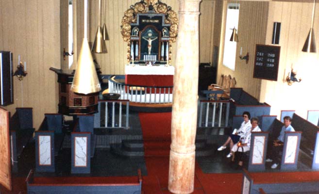 This is a picture taken inside the Svenes Church. The Church was built in 1735. It was moved in 1859 from Svenes property to Strond property where it is currently located. The center support column was made with the help of Sven Johannesen Haugen (Sven Johnson). Seated are Loretta Johnson, Gudrun Kullhuset and Son Sigbjorn.