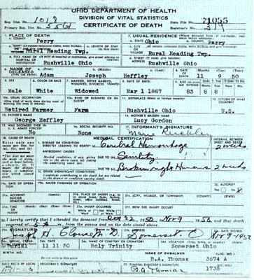 New Lexington, April 20 - George Heffley, a farmer living six miles west of Somerset, who will observe his 91st birthday Thursday, boasts that he has never been sick a whole day in his life, never had the services of a physician and never had a very severe cold until last week, when overtaxed himself digging post holes. He does much work about his farm. He is a native of Germany.He reared a family of 12 children, nine of whom are still living; William, Junction City; John and Adam of the home; Mark, Somerset; Albert, Zanesville; James, George and Edward of Gretna, Neb. and Mrs. Joseph Smith of Somerset. Celebration of the anniversary will be carried over until Sunday, when a big family gathering and dinner will take place