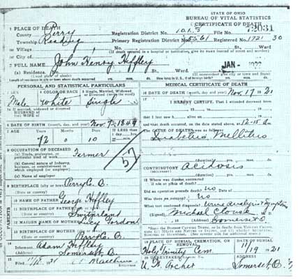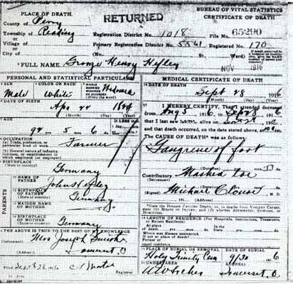 The question of where George Henry was born is not decided. His death certificate says Germany with the informant being Mrs. Joseph Smith. His son William's death certificate says Germany with the informant being Blanche McCasus. Sons Adam and Albert were informants on death certificates for two brothers and they say Stitzerland. Mrs. E.J. Zimmerman was the informatn for Geroge and she said Switzerland.