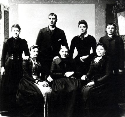 The first picture below shows the Marit Halverson family. In the back row, left to right, Caroline (Mrs. Tom Christensen), Halvor (married Anna Simonson), Mary (Mrs. John S. Johnson), Martin.